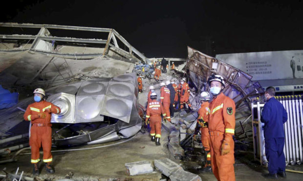 Rescuers work at the site of a collapsed five-story hotel building in Quanzhou city in southeast China’s Fujian province Saturday, March 7, 2020. The hotel used for medical observation of people who had contact with coronavirus patients collapsed in southeastern China on Saturday, trapping dozens, state media reported. (Chinatopix Via AP)