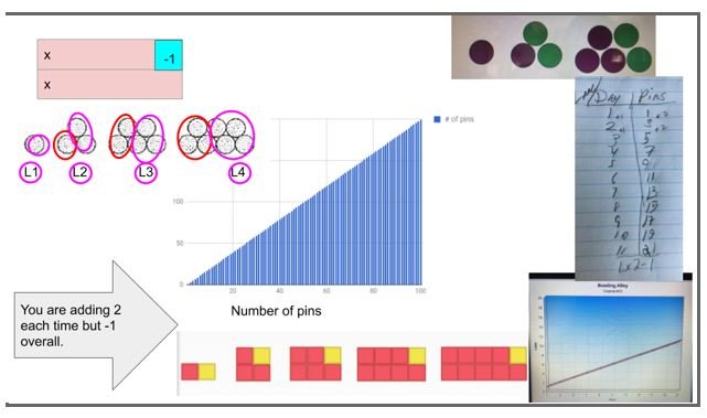 This slide shows the work of four students in a small breakout room as they used models to describe a growing pattern.