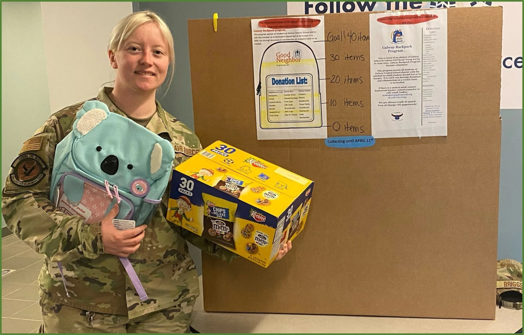 The most recent event was a drive to collect food and toiletry items for the Galway Backpack Program in Galway, New York, which is about 15 miles north of the base in Saratoga County.