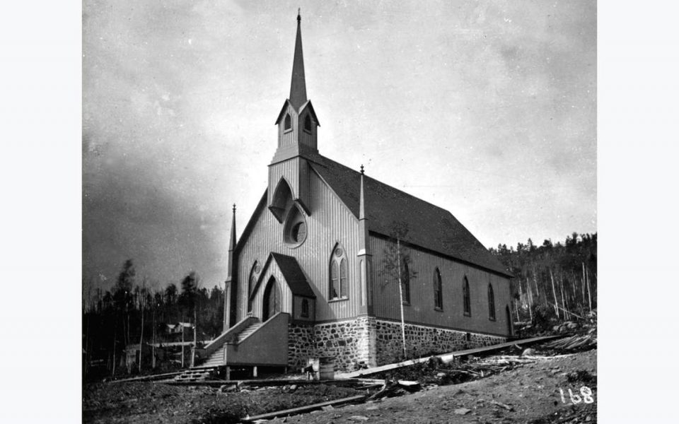 Duluth’s 1870 Sacred Heart Roman Catholic Church. It was destroyed by fire in 1892 and replaced by Sacred Heart Cathedral, now a music center. (Photo courtesy of the Duluth Public Library)