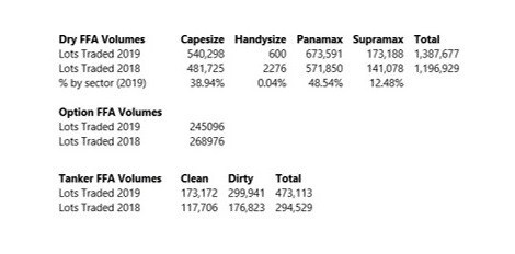 “2019 was another solid year for the freight derivatives market. Underpinning these volumes are both volatility in the freight markets and trust in the Baltic Exchange’s settlement data. Last year both the dry bulk and tanker markets experienced big swings, with issues ranging from the Vale iron ore disaster, attacks on tanker shipping in the Middle East and IMO2020 impacting sentiment.”