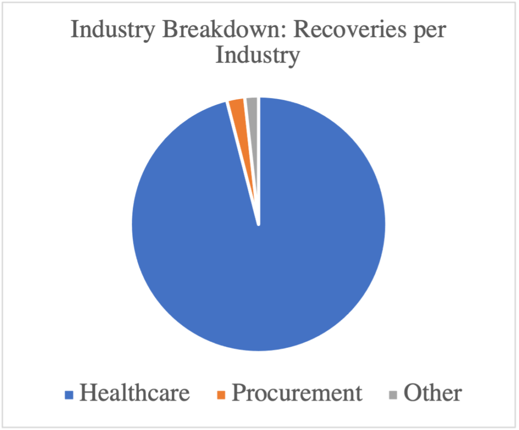 PROCUREMENT FRAUD: Of the more than $5.6 billion in total settlements and judgments, only $120 million (2%) of total recoveries related to procurement fraud, predominantly within the Department of Defense. In this area, the DOJ pursued a variety of fraud matters involving the government’s purchase of goods and services, for example where government contractors falsified pricing data, provided non-compliant goods or services, or engaged in unlawful kickback schemes. Though this percentage of recoveries is fairly consistent with prior years (recoveries in this area approximated 3% in FY20), we are surprised that the number of cases and recoveries involving government contracts is so low.