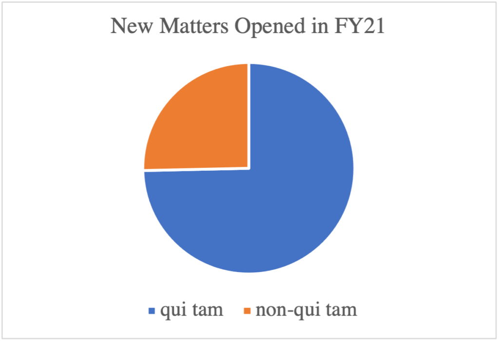 According to the accompanying DOJ Press Release, FY21’s recovery, “is the second largest annual total in False Claims Act history, and the largest since 2014.” Though the FCA actions that gave rise to these settlements and judgments likely were initiated before FY21, these significant recoveries show that AG Garland’s new Justice Department was quite active in pursuing and resolving FCA matters and insisting on accountability and substantial monetary penalties. And despite Covid-19, DOJ also was active in initiating new FCA matters. DOJ initiated 203 cases in FY21 (an average of 4 new matters per week), which similarly earns the second-place award – it is the second largest number of non-qui tam new matters opened in one year since DOJ began keeping track of these numbers. DOJ attributes the increase in government initiated FCA actions in large part to more sophisticated data analytics used to identify questionable patterns, trends, and outliers (see, e.g., remarks).