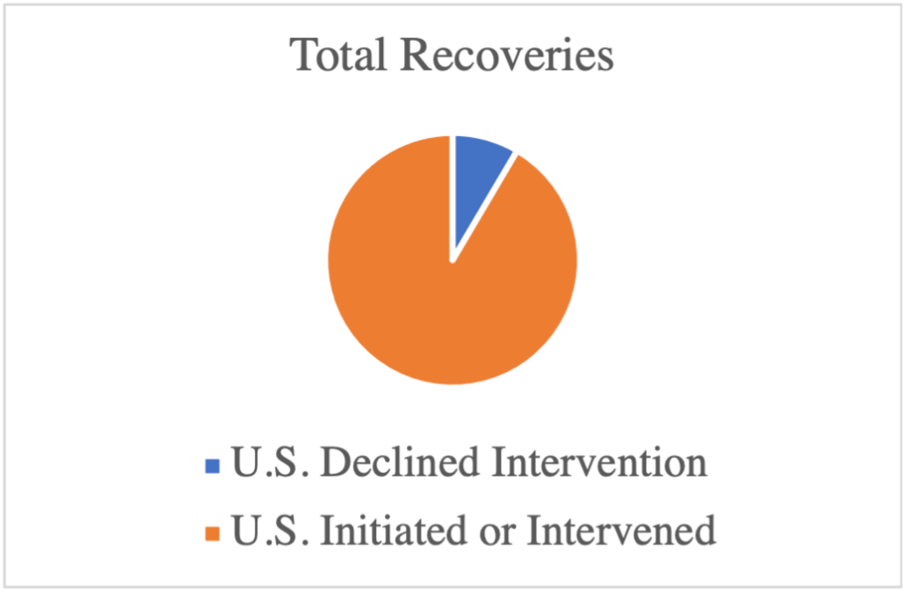 Consistent with the past several years, the lion’s share of recoveries came from FCA matters where the government intervened or otherwise pursued the matter. Only 8% of the total amount recovered in FY21 came from qui tam actions where the government declined intervention. Year after year, the FCA statistics confirm that the most crucial stage of an FCA action for qui tam relators and defendants alike is during the government’s intervention decision-making process. |