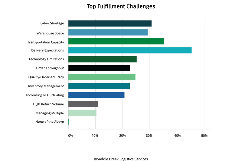 Survey respondents faced a litany of fulfillment challenges in the past year. The top five were delivery expectations, transportation capacity, the labor shortage, warehouse space and technology limitations.
