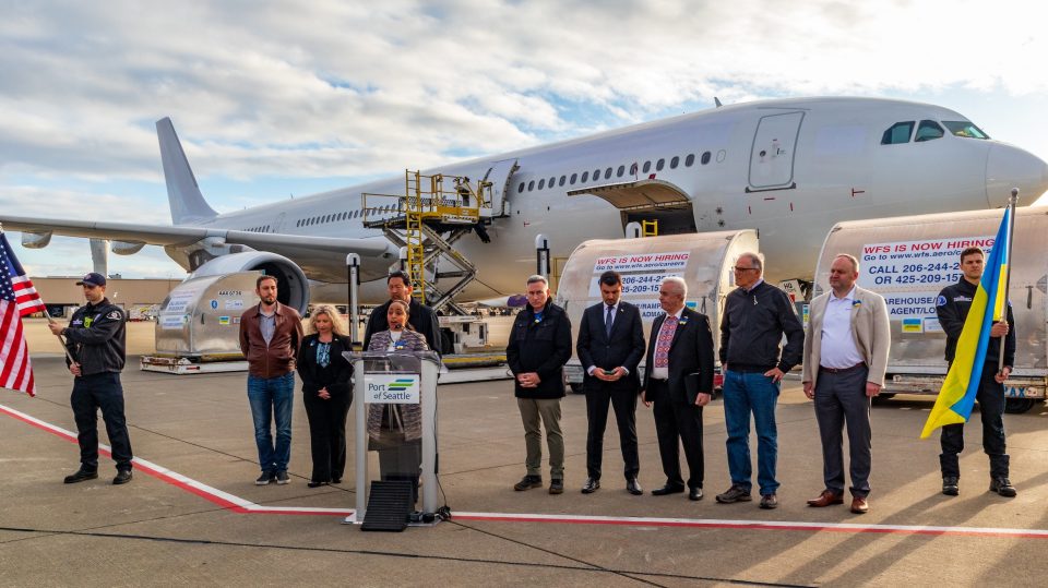 A joint effort of humanitarian nonprofit Nova Ukraine and Stanford University Students partnered with the Ukrainian Association of Washington State (UAWS) to coordinate $3.5 million worth of emergency medical supplies that have been loaded on a cargo flight headed out in the next few days to Ukraine from Seattle-Tacoma International Airport (SEA). Gov. Jay Inslee, Seattle Mayor Bruce Harrell, and Port of Seattle Commissioner Hamdi Mohamed were on-hand to highlight these Ukrainian community organizations and the relief efforts underway throughout the region.