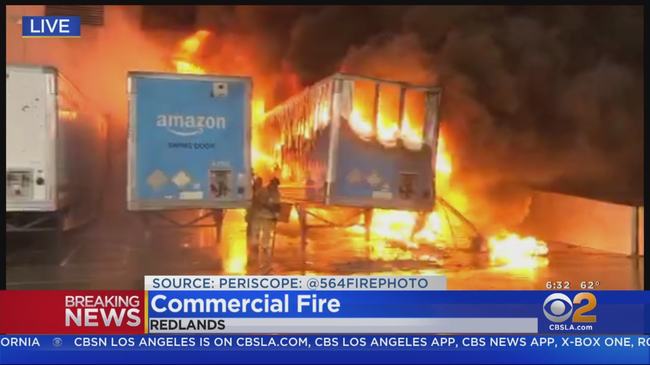 3-Alarm Fire Erupts At Amazon Distribution Center In RedlandsInvestigators are trying to determined what caused a three-alarm blaze which tore through an Amazon Distribution Center in Redlands early Friday morning while employees were working inside. Fortunately, no one was hurt.
