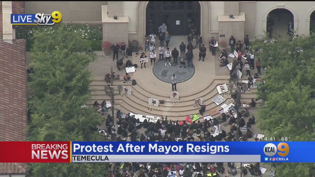 Protesters Gather Outside Temecula City Hall After Mayor ResignsTemecula Mayor James “Stew” Stewart resigned Thursday night amid backlash over an email he wrote about police killings.