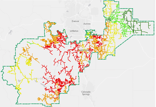 CORE combines data from the Colorado State Forest Service with the electric network data in ArcGIS. This data includes wildfire risk and burn probability. Using spatial analysis, CORE assigns risk values to electric system components and line segments. Each circuit receives a risk designation. Each line segment and device is tagged with precise information. Detailed risk data helps drive critical mitigation as well as operational decisions.