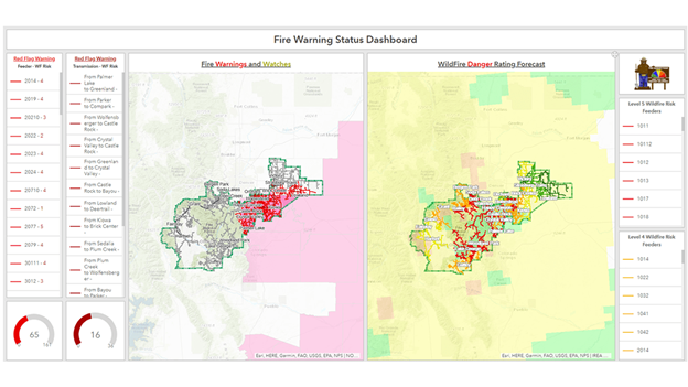 CORE leverages Colorado’s Fire Guard notification system and Wildfire Incident Management System. CORE presents warnings and system details with ArcGIS Dashboards and maps. As a result, situational awareness is raised across the organization. Users in the office and the field readily explore conditions in those areas on their displays. The transmission and distribution elements are color-coded based on risk and shown with the seven-day weather forecast.