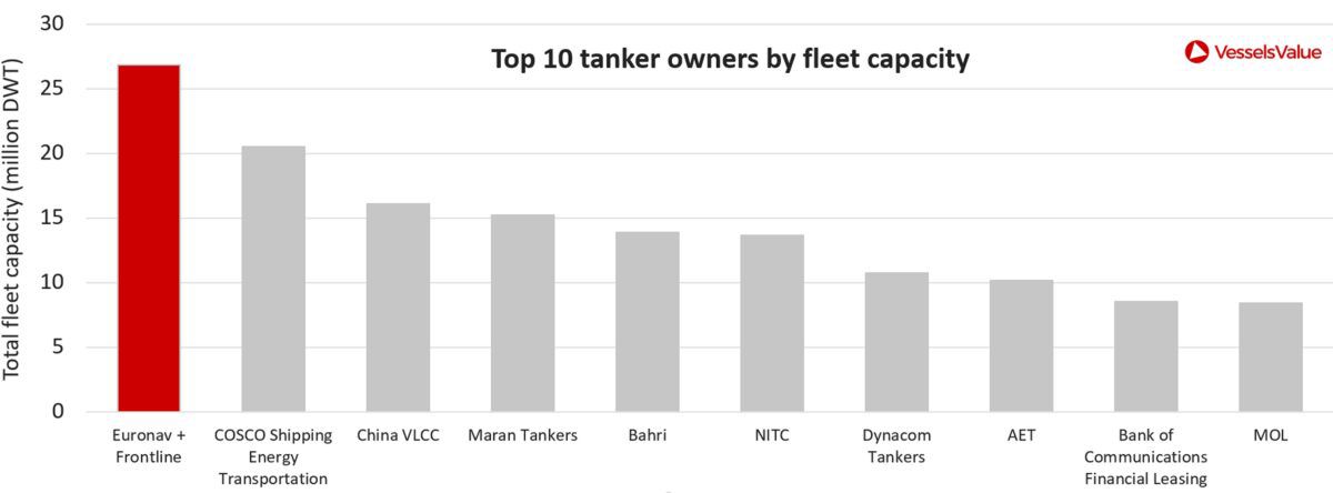 U.K.-based VesselsValue provided American Shipper with its latest data on the top tanker owners. The Euronav-Frontline combo would top the world rankings with 26.8 million deadweight tons (DWT) in owned capacity.
