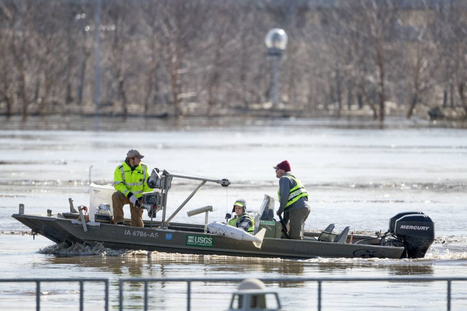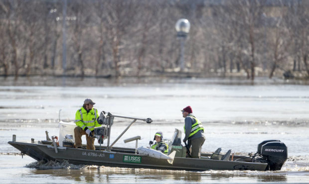 FILE- In this March 16, 2019 file photo, surveyors with the USGS take measurements of the Missouri River in Omaha, Neb., as the river overflows its banks. Nebraska, Iowa, Kansas and Missouri are joining forces for a study that will look for ways the states can limit flooding along the Missouri River and give them information about how wetter weather patterns could require changes to the federal government’s management of the basin’s reservoirs. The states are pooling their money to pay for half of a $400,000 study with the U.S. Army Corps of Engineers to measure how much water flows down the Missouri River. (AP Photo/Nati Harnik)