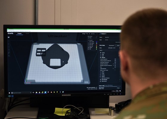 U.S. Air Force Tech. Sgt. Tracy Gibbs, 312th Training Squadron Special Instruments Training course graduate, prepares a 3D printed N95 face mask to be printed through modeling software.