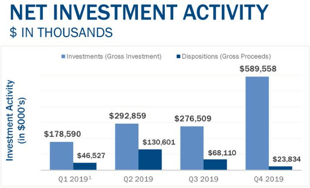 With interest rates low and a relatively high stock price in Q4 2019, Spirit was a net buyer, investing $575 million to purchase 139 properties while disposing of 11 properties for $24 million.