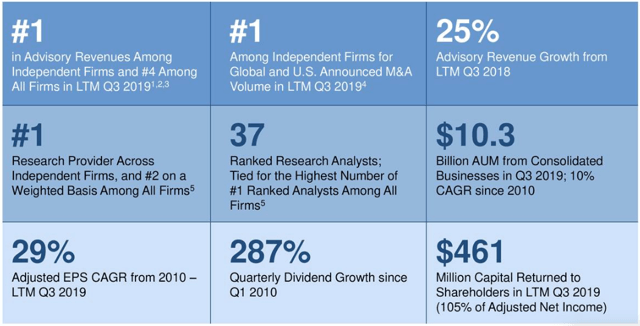 Evercore is an investment banking advisory firm focused on M&A deals along with restructurings, IPO underwriting, shareholder activism, debt issuance, and other significant financial deals. They are the well-oiled joints of the Wall Street machine, ensuring that major deals are structured properly and proceed smoothly. EVR also provides some of the highest quality equities and economics research on Wall Street through its ISI division.