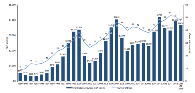 It is important to note, however, that the overall trajectory of total M&A volume is to rise over long periods of time. Plus, lower interest rates tend to help facilitate more leveraged buyouts and M&A. It would not be surprising to see M&A activity come in quite strong in 2020 with the combination of low rates and the potential necessity to merge due to economic stresses. Alternatively, if we experience a wave of bankruptcies, Evercore could benefit from that, too.