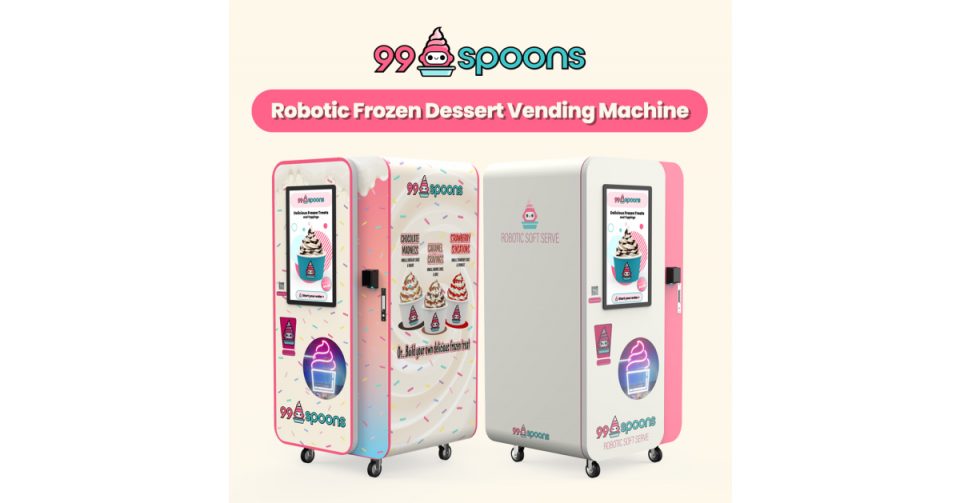 The 99 Spoons robotic soft serve vending kiosks are self-contained, no plumbing is required. Touch screen ordering makes the kiosk completely contactless. Remote cloud-based monitoring allows the company to track sales and technical data. Each kiosk features a 32-inch touch screen which has a capability for on screen streaming advertisements and promotions. Finally, the kiosks take up a mere 10 square feet, making the footprint small enough to be installed almost anywhere within each location.