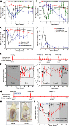 Blood glucose levels in diabetic rats after treatment with (A) regular insulin–loaded MNs fabricated from different materials and (B) different types of insulin-loaded Gel MNs. Effects of various application methods of insulin on (C) blood glucose levels and (D) plasma insulin concentrations in diabetic rats. (E) Experimental timeline. (F) Blood glucose changes in diabetic rats received food ad libitum (control) and standardized breakfast-lunch-dinner feeding patterns. Blood glucose excursion (∆BG) was significantly higher at the first feeding of the day than at the other times. (G) Timeline. (H) Rat dorsum inserted with one and three patches of the insulin-loaded IMP, respectively. (I) Blood glucose levels in diabetic rats after treatment with different numbers of the IMP. S.C., subcutaneous. Photo credit for (H): Bozhi Chen, Beijing University of Chemical Technology.