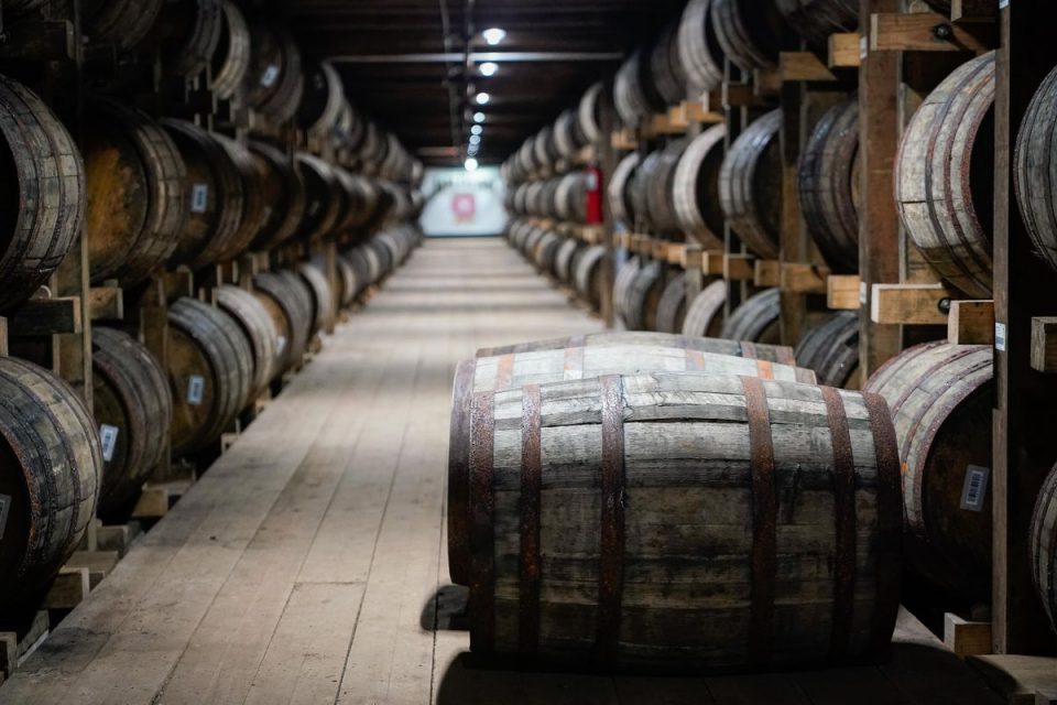 CLERMONT, KY – FEBRUARY 17: Barrels of bourbon are stacked in a barrel house at the Jim Beam … [+]