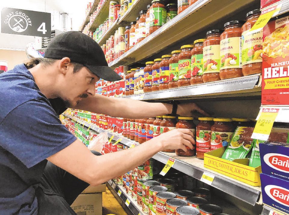 • Store manager Andrew Jensen stocks the shelves at Ouray Grocery after a delivery arrived in December. The store has been dealing with supply chain issues since last spring and there is still some inconsistency in availability of different items from week to week, co-owner Tom Fedel said. Liz Teitz — Ouray County Plaindealer