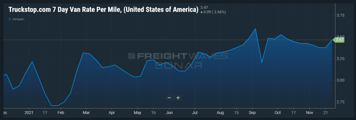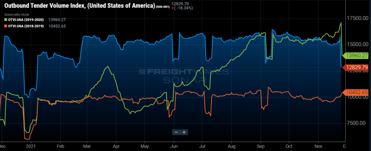 Pump up the volume — So, why haven’t rates skyrocketed in November as they usually do? Look at that chart above: With freight volumes at perpetual peak season levels for a year, holidays have been the only relief on the calendar. In fact, counter to what usually occurs, we even saw a dip over Thanksgiving when volumes would usually pop. That aligns with historically low inventory levels. Due to congestion, shippers can’t hold off on moving freight and then slam carriers with pull forwards ahead of the holidays. Instead, they’re trying to move any and all goods that are available and have been doing so throughout the year.