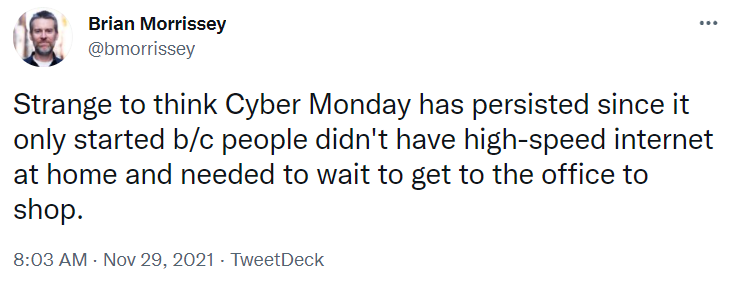 More of a gray Friday tbh — Are the days of trampling our fellow shoppers on Black Friday a thing of the past? CNBC reports, “Traffic at retail stores on Black Friday dropped 28.3% compared with 2019 levels.” I was in a Walmart here in Chattanooga braving the fray for some Christmas lights, and anecdotally it seemed like any other day at Wally World. Thanksgiving Day traffic looked even worse as it hit the earth like the Ever Given trying to cross the Suez, down over 90% according to Sensormatic.