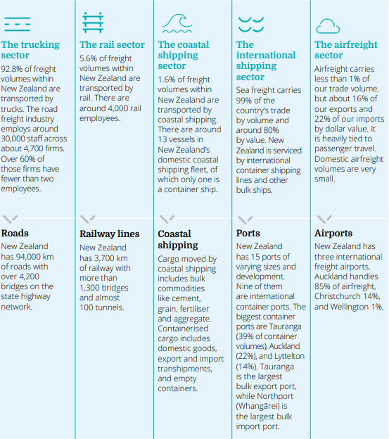♦ Trucks, trains, ships, and planes move about 280 million tonnes of freight a year around NZ.