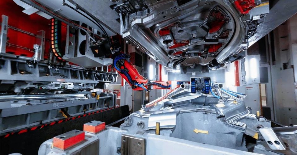 The drone deftly flies through the factory and shows the impressive machines responsible for producing Tesla’s Model Y vehicles.