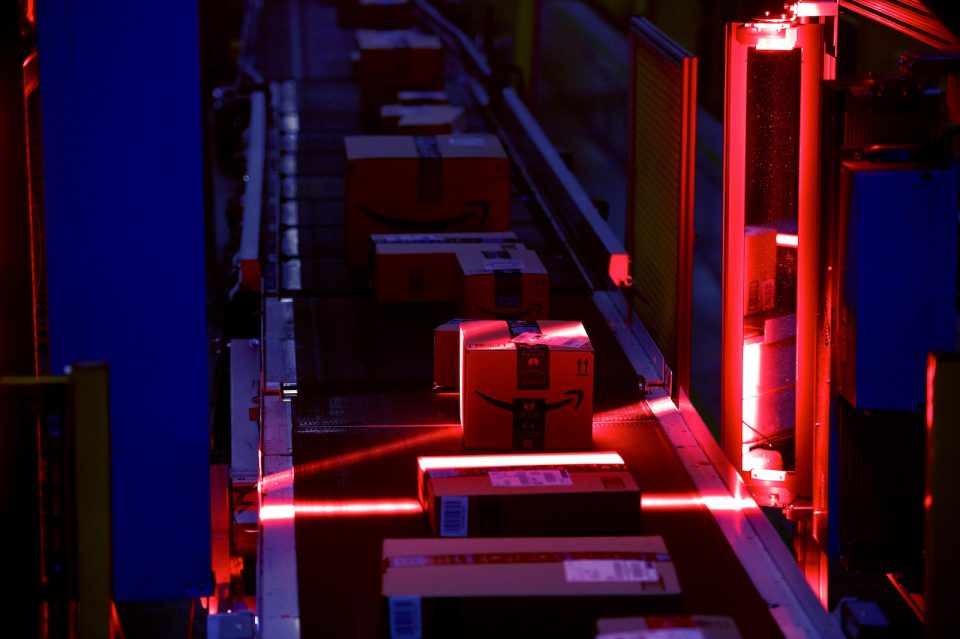 Boxes are scanned with lasers while traveling on a conveyor belt at the Amazon Fulfillment Center on August 1, 2017, in Robbinsville, New Jersey. The more than 1 million square foot facility holds tens of millions of products, features more than 14 miles of conveyor belts, and employs over 4,000 workers, who pick, pack, and ship orders.