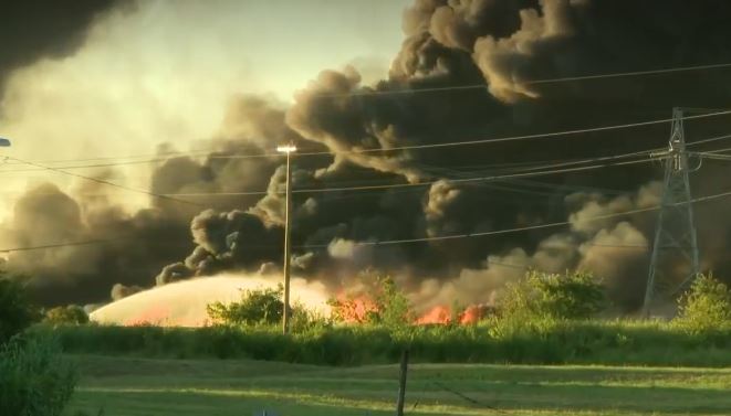 GRAND PRAIRIE, Texas (AP) — A large fire is burning at a Texas factory where trash bags and other plastics are produced.