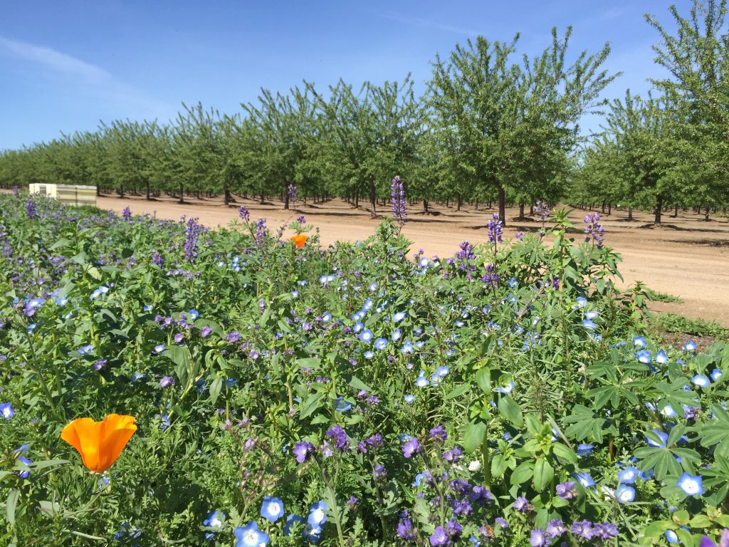Wildflower habitat alongside almond groves can bring multiple benefits to both farmers and pollinators. (Photo credit: University of California, Davis).