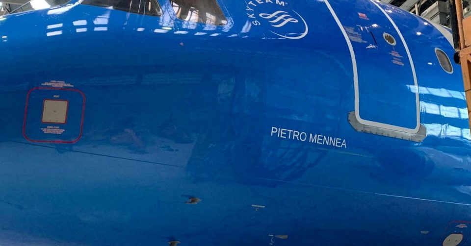 A new state-owned Italian carrier Italia Trasporto Aereo (ITA Airways) plane with the new blue livery dedicated to the Italian sprinter Pietro Mennea, is seen at Fiumicino airport, in Rome, Italy, January 11, 2022. Picture taken January 11, 2022. Ita Airways Press Office/Handout via REUTERS. ATTENTION EDITORS – THIS IMAGE HAS BEEN SUPPLIED BY A THIRD PARTY./File Photo