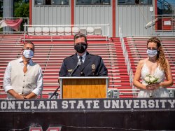 The wedding, officiated by Chief of University Police Paul Cell, observed the mandatory safety measures, including social distancing on the athletic field and the wearing of face coverings to reduce the risk of COVID-19 spread. The Montclair State mascot, Rocky the Red Hawk, served as ring bearer.