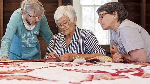 Carolyn Lingone stares intently at a silver needle just a few inches from her face as she does the meticulous work of quilting. As she keeps her eyes and hands focused, three other women a few feet away are doing the same. They are about 500 total hours into working on this quilt, which so far is a mix of red triangles sewn together to resemble angular pines. They’re lined up in rows against a cream background.