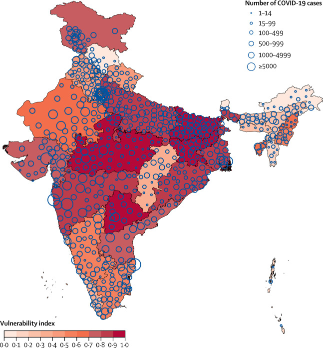 Figure 2Overall COVID-19 vulnerability index in districts of India and number of confirmed cases as of June 17, 2020