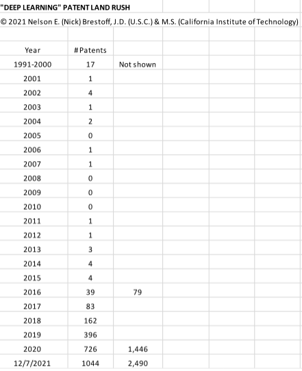 Deep Learning Patent Update – provided by Nelson E. (Nick) Brestoff, J.D., M.S. Exec. Manager & Chief Inventor, Intraspexion LLC. On December 7th, 2021, the Land Rush for Deep Learning patents reached 1,044. With three opportunities in 2021 for the USPTO to announce new patents, the total for the year may well hit 2,100. That’s a big leap from 726 in all of 2020.