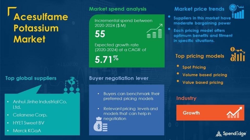 The Acesulfame Potassium market will register an incremental spend of about $55 million, growing at a CAGR of 5.71% during the five-year forecast period. A targeted strategic approach to Acesulfame Potassium sourcing can unlock several opportunities for buyers. This report also offers market impact and new opportunities created due to the COVID-19 pandemic . Request free sample pages