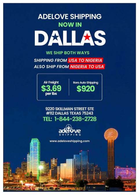 Do you live around Garland,Richardson, Plano, Allen, Frisco, McKinney, Lewisville, Grapevine, Desoto, Mansfield, Benbrook, Kaufman, Burleson, Greenville, Royse City in State of Texas? And you’ve been checking for an affordable freight forwarding company that ships from USA to Nigeria as well as delivering cargo from Nigeria to USA? The popular Nigerian Shipping Line, Adelove Shipping offers the great opportunity for Nigerians residing in USA that ship goods to their loved ones via Air Freight or Ocean freight to Nigeria from USA as well as from Nigeria to USA