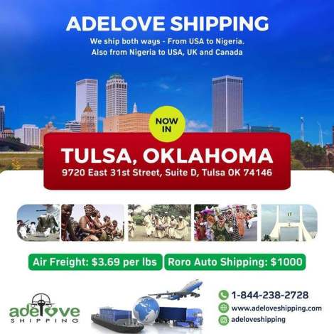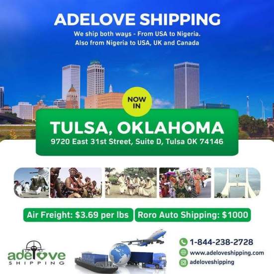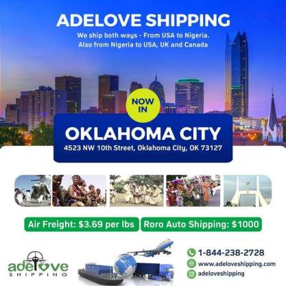 Adelove Shipping opens new locations in Oklahoma State – Oklahoma City and Tulsa (See other locations, phone numbers to reach out to the Representatives and Emails below). Adelove Shipping ship twice weekly via Air Cargo – Wednesday and Fridays with ETA delivery 7 to 10 business days. They specialize in Small and Large packages, Oil and Gas supplies, Pipes and heavy equipment.