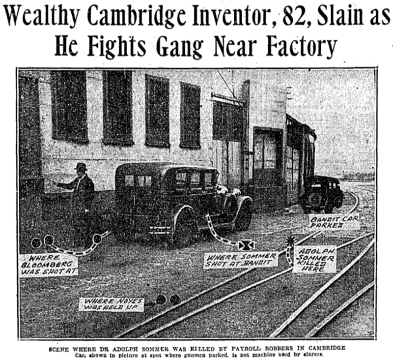 In October 1933, 82-year-old Sommer and his plant superintendent, Hans Bloomberg, picked up more than $1,000 from the Lechmere Bank on Cambridge Street before driving back to the factory to pay the workers. As they arrived at the factory, five robbers with pistols trapped the car and demanded the money. One man pointed a gun at Sommer’s face. When he saw the pistol, Sommer is said to have swung his driver’s-side door open and lunged at the robbers, gathering his own pistol from his pocket. Upon lunging, he was shot three times and died – but not before shooting one of the thieves, who fled in a car over the Prison Point Bridge to Charlestown.