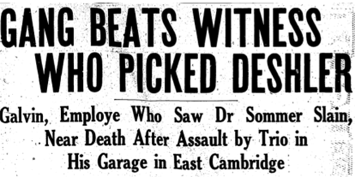 There were few leads, but a witness identified the shooter to Cambridge police as James Deshler. It was soon revealed to the public that the witness was Edward Galvin, of 22 Lambert St., in the Wellington-Harrington neighborhood, and within a week of Deshler’s arrest three men attacked Galvin in a parking lot, seemingly as retribution. They were never identified. Two men were eventually imprisoned for Sommer’s robbery and murder: Deshler and Marshall “Hickey” Bowles.