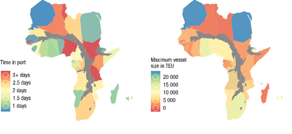 Container ship port calls in Africa, time in port, and maximum container ship sizes 2020 (for illustration purposes country size proportional to the number of container ship port calls)