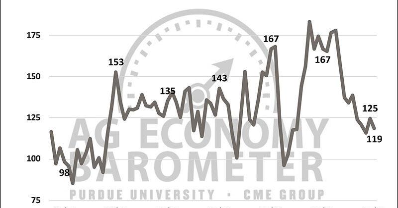 WEST LAFAYETTE — Farmer sentiment weakened in January as the Purdue University/CME Group Ag Economy Barometer declined 6 points to a reading of 119, its second-lowest reading since July 2020.