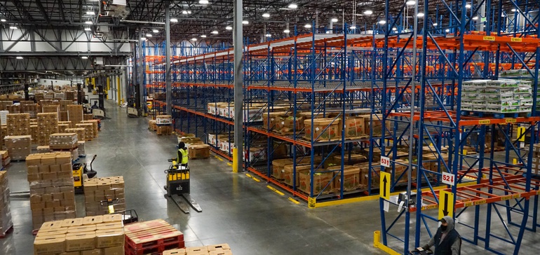 A warehouse worker drives a forklift through Ahold’s break-pack and frozen distribution center in Butner, North Carolina, which services the Food Lion brand.