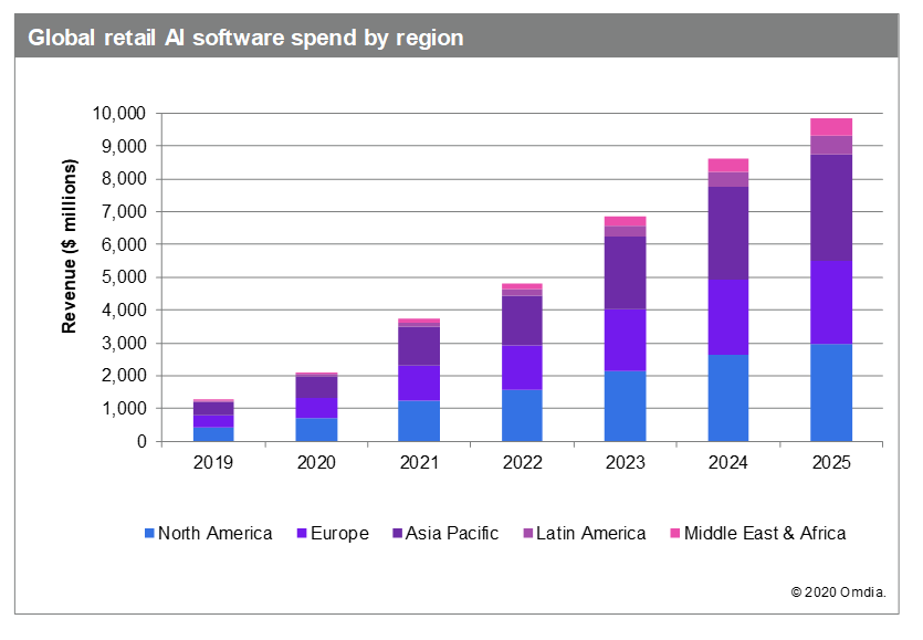 Worldwide spending on AI software for retail uses is forecasted to expand to $9.8 billion in 2025, up from $1.3 billion in 2019, according to the Artificial Intelligence for Retail Applications report from Omdia. Globally, retailers will invest $37.3 billion on AI-driven solutions from 2019 through 2025.