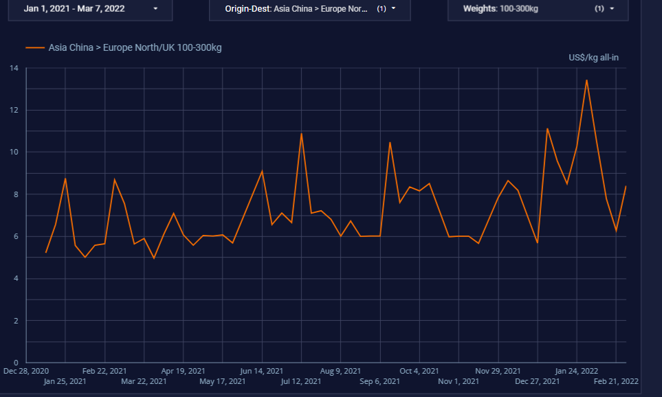 According to the Freightos Air Index, China-Northern Europe rates jumped 34% in the past week to $8.40 a kilogram, just below the year-ago level when post-Chinese New Year shipping was especially strong. Globally, the average spot rate jumped 26 cents, or 6.4%, to $4.31 per kilogram in the past week.