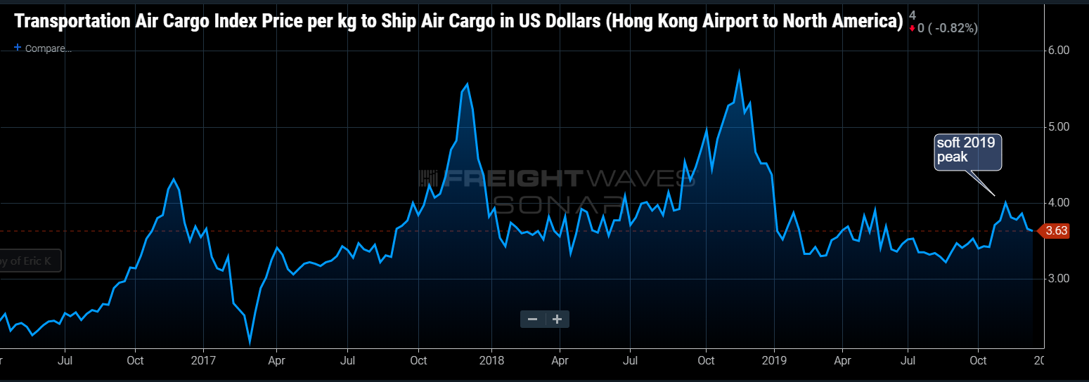 Volumes have increased in the fourth quarter compared to earlier this year, but were down 28% year-over-year in November on the Hong Kong-North American trade lane, according to the The Air Freight Index Co., which benchmarks pricing for the air cargo industry. Then again, last year was a record for airfreight out of Asia.
