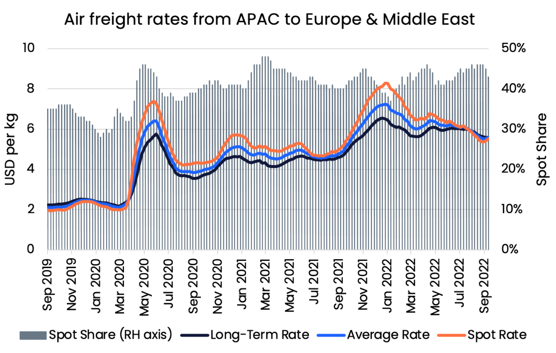 Because of continuous market disruption and general uncertainty since the beginning of the pandemic, carriers have allocated more space to the spot market compared to the long-term market. By mid-September 2022, the share of cargo weight sold in the spot market was 43%, up 8 points from three years ago, according to Xeneta.