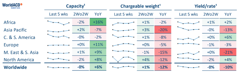 Air export volumes in the Asia-Pacific region are down 20% from last year’s elevated highs, while North American outbound tonnage is down 12% on a yearly basis, WorldACD reported.