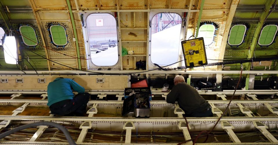 Labourers work inside and around a passenger plane as they convert it into a cargo plane at Israel Aerospace Industries site in Ben Gurion International Airport, Lod, Israel December 10, 2020. Picture taken December 10, 2020 REUTERS/ Ronen Zvulun